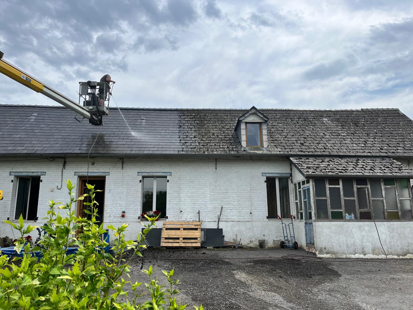 Bij deze klus is de 17 meter aanhanger hoogwerker gebruikt. Wij hebben het dak schoongespoten met de hogedrukspuit.